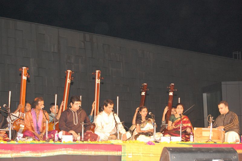 The presentation featured the Hindustani santoor maestro Shivkumar Sharma and the renowned Carnatic vocalist Dr. M. Balamuralikrishna.  They spoke of the inspiration they drew from earlier recordings or how they had diverted from them.  They played back some of these recordings for the audience.  This was followed by their musical response to this music from the past.